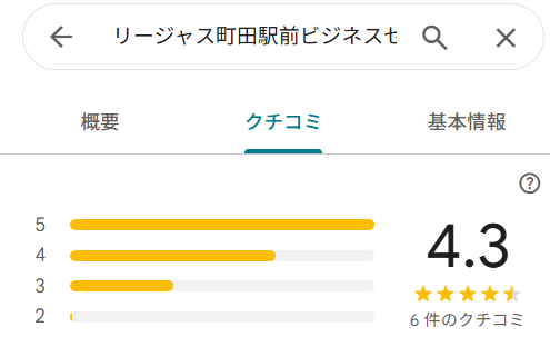 リージャス町田駅前ビジネスセンターはGoogleビジネスプロフィールで6件・評価4.3と、多くの利用者から高評価を得ています。 口コミでは『内装も素敵です。まさにリージャスと呼ぶにふさわしいですね』という声があり、上質な内装とブランド力が強く支持されています。